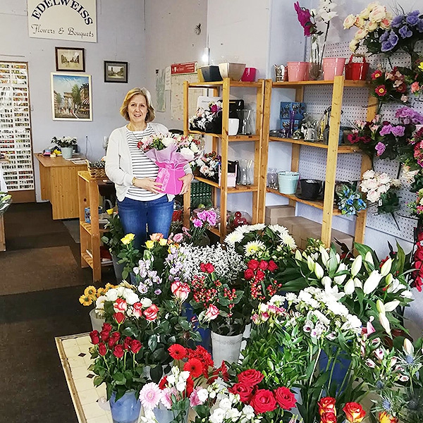 At Edelweiss florist Linda and Derek have been working hard for 28 years, producing beautiful flower arrangements, bouquets, sprays and all forms of floristry for all your special days including weddings, anniversaries, birthdays and thank-you's etc. We just love hand delivering our specially selected flowers to all the surprised and happy recipients passing on your loving wishes. Of course we are here to help in life's more difficult times of illness, sadness and bereavement with a kind and sympathetic understanding.